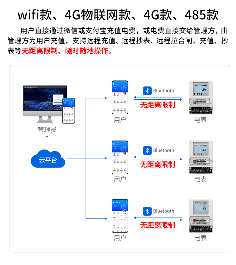 能電表的數(shù)據(jù)信息遠傳及操縱數(shù)據(jù)信號傳輸技術(shù)有很多種多樣,例如4G網(wǎng)絡(luò)、NB物聯(lián)網(wǎng),以太網(wǎng)(寬帶傳輸),無線WIFI等。電表的數(shù)據(jù)收集插口一般為RS485,會依據(jù)地區(qū)的劃定將小范圍內(nèi)(例如一個單元)的電表根據(jù)RS485開展并接。由數(shù)據(jù)集中器對地區(qū)內(nèi)的電表的信息完成收集及解決,并根據(jù)外網(wǎng)地址(采集器)將聚集的信息上傳入電力企業(yè)的網(wǎng)絡(luò)服務(wù)器,由網(wǎng)絡(luò)服務(wù)器后臺管理手機軟件對信息完成處置及剖析后,除電力企業(yè)的監(jiān)督外,還可以遠程在線繳費充值。電表除了可以遠程控制收集用電量信息外,一樣還可以對用電量個人行為開展管控和操縱,當(dāng)發(fā)現(xiàn)異常用電量個人行為時,能夠根據(jù)遠程操作的形式開展關(guān)閉電源,而且在后臺管理軟件傳出提示,通知管理單位。