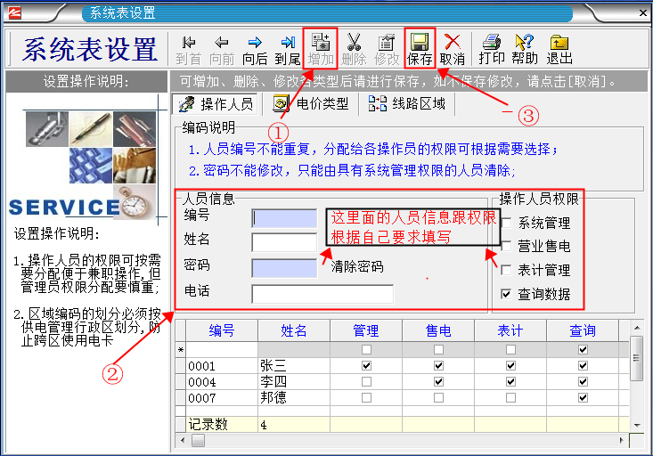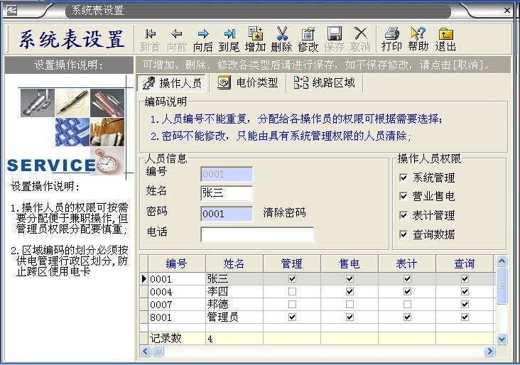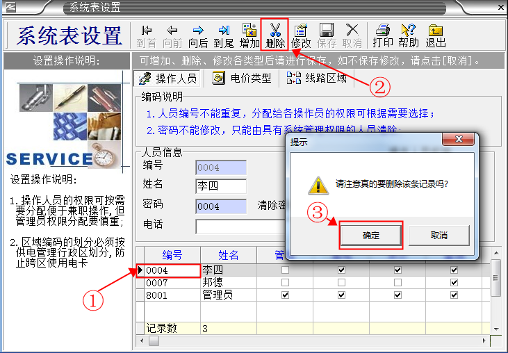 系統(tǒng)默認的管理人員有“張三、李四、德邦、管理員”。 其中“管理員”是最高權(quán)限擁有者,不能刪除。其它人員能夠隨意刪除增加。